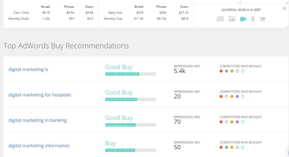 The tool also provides suggestion regarding the keyword that you’re going to use for your website. For example: When you search for the keyword “Digital Marketing”, it gives various insights and also a suggestion like “This keyword is competitive. There is a 38% chance you can rank in the top 20.”