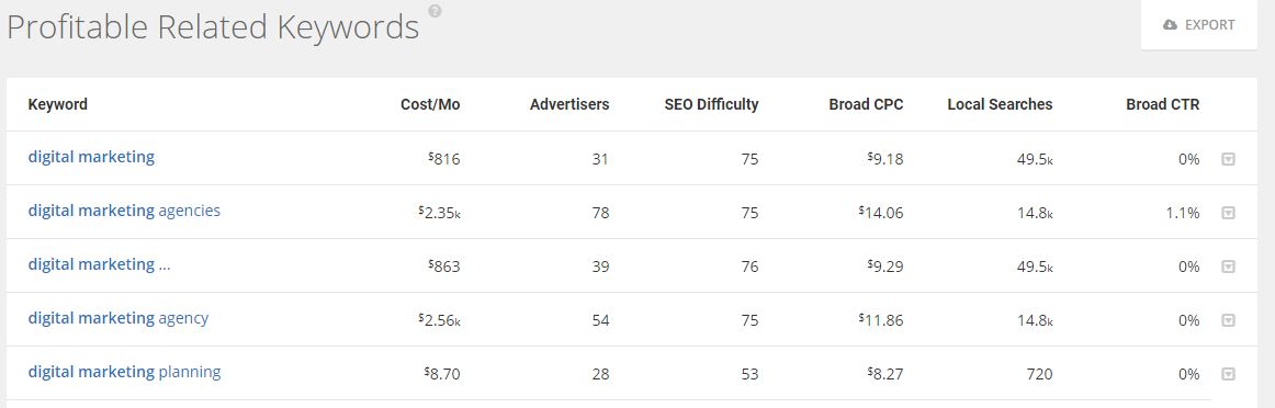 SEOprofiler is an amazing tool to find the most suitable keywords for your website and blog. This tool lets you use the amazing filter through which you can filter out the required information like position of seed keyword, competition, opportunity, search volume and CPC. The tool shows the entire list of relevant keywords which are useful for you along with the required insight. The tool have column: Action. This column lets you check the required keyword chart which shows the trending part of the keyword.